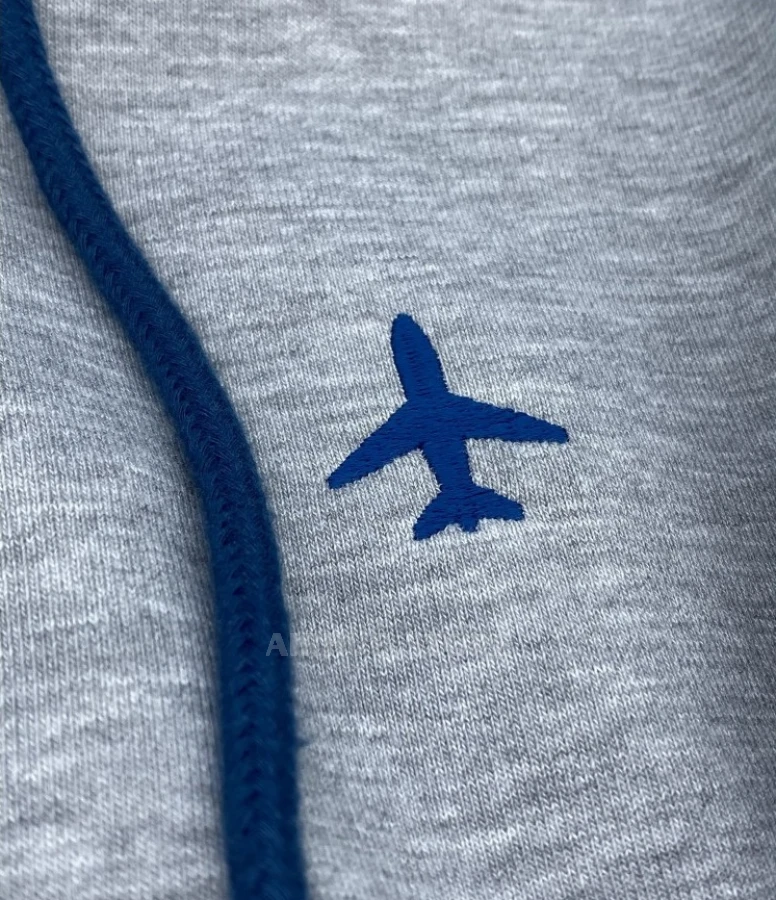 The main emphasis is placed on minimalistic but expressive elements - embroidered silhouettes of airplanes that symbolize the freedom of flight and the dynamics of movement. Black embroidery on black fabric creates the effect of depth and restrained elegance, which emphasizes the premium nature of the product. Additional details, such as neat red and green accents, recreate real aircraft navigation lights, adding a special charm and authenticity to the sweatshirt.