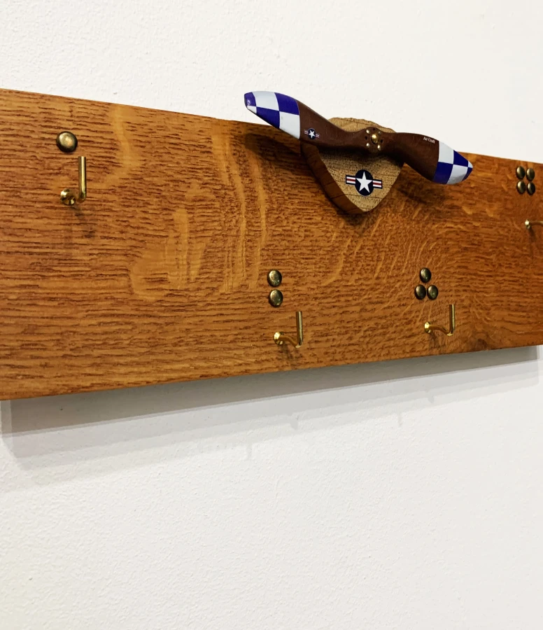 This stylish wall-mounted key holder is not just an organizer, but a real art object for aviation fans. The base is made of natural oak, and a decorative accent - a wooden aircraft propeller on a magnet - adds uniqueness and thematic character to the product. The keys can be easily removed, carried around, and immediately hung back up. A well-thought-out design makes this key holder not only a decorative but also a functional part of your interior - especially if you appreciate aviation aesthetics.