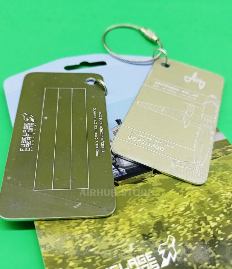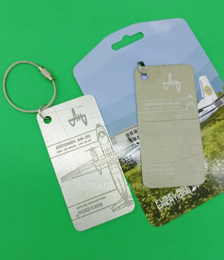 The keychain was made from the skin of the An-30 airplane. All the keychains have a unique serial number, 1300 pieces were made in total.