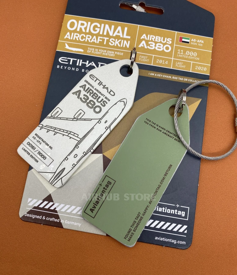 A unique airplane tag made from a genuine Emirates Airbus A380 body, the legendary A6-EDA. A limited edition dedicated to the airports visited by the aircraft.
