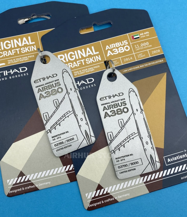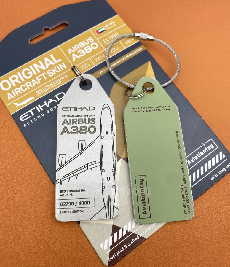 A unique airplane tag made from a genuine Emirates Airbus A380 body, the legendary A6-EDA. A limited edition dedicated to the airports visited by the aircraft.
