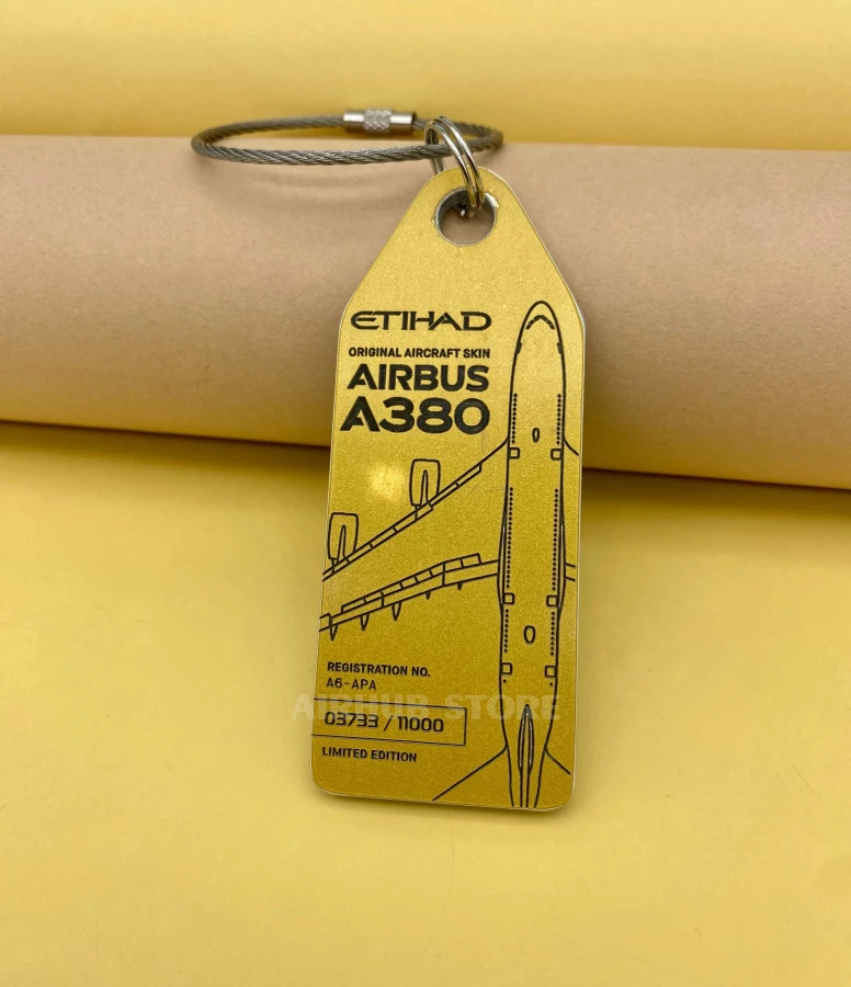An original aircraft tag made from genuine Etihad Airways Airbus A380 skin. A real piece of the legendary A6-APA aircraft, transformed into a collectible accessory with a history.