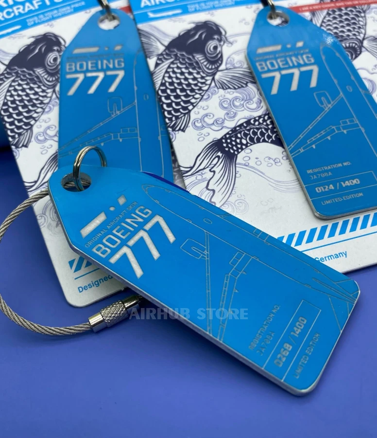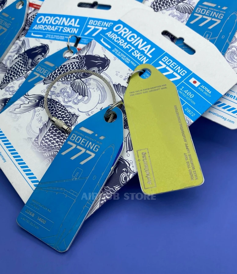 This keychain was made from the skin of the Boeing 777 JA708A ANA aircraft. All keychains have a unique serial number, 1400 pieces were made in total.