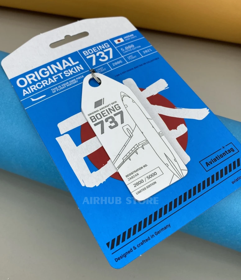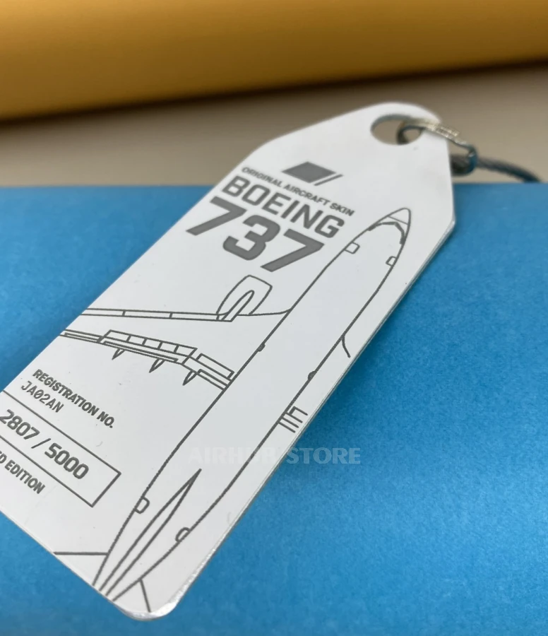 The keychain is cut from the skin of a Boeing 737 - JA02AN, All Nippon Airways (ANA). A member of the Star Alliance in your collection. The Boeing 737-700 was delivered to the Japanese carrier in January 2006 with MSN 33872. After only 15 years of service, JA02AN retired in May 2021 and was then parked in Victorville.