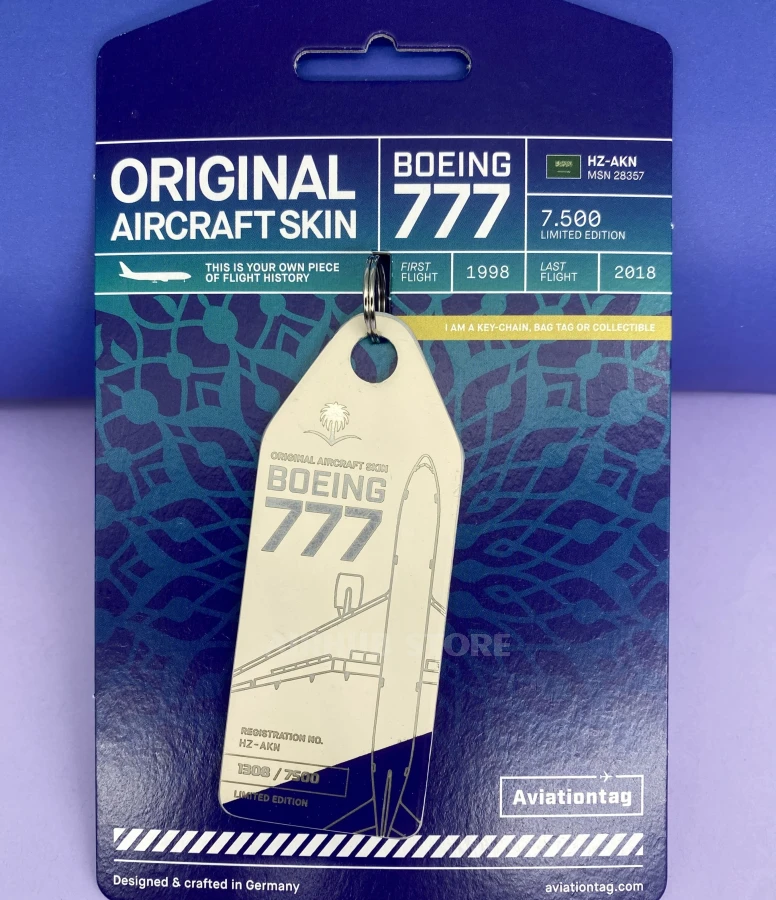 This collectible tag is made from a part of the fuselage of a Boeing 777-200ER with the registration number HZ-AKN, which flew under the flag of Saudi Arabian Airlines for 20 years. The aircraft, which can accommodate 341 passengers, made its maiden flight in 1998 and took off for the last time in 2018, after which it was sent for storage in the United States.