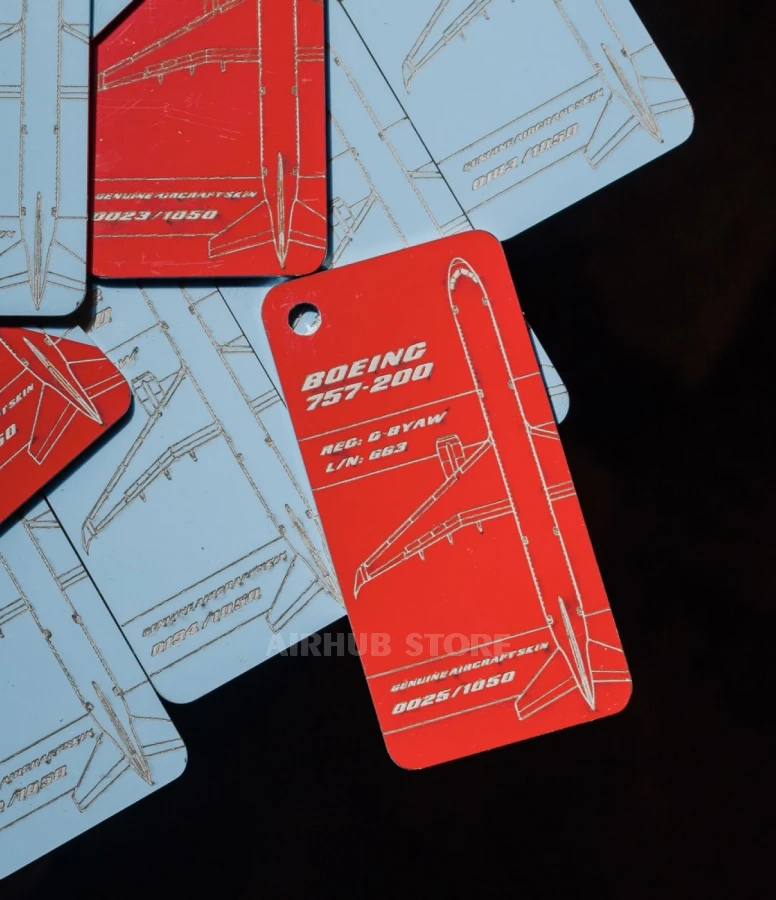 This B757 airplane skin keychain was one of fourteen aircraft in the TUI Airways fleet and operated most of its flights from Gatwick and Manchester airports for tourist purposes. The G-BYAW aircraft has a long history - it was originally part of the Britannia Airways fleet in 1995. In 2005, the management company Thomson Holidays rebranded its subsidiaries, as a result of which Britannia Airways changed its official name to Thomsonfly, which has now been renamed TUl Airways. In 2019, the aircraft was decommissioned and acquired by 2Excel Aviation as a spare parts donor. Thanks to 2Excel Aviation - Fuselage Creations were able to produce these tags for B757 fans around the world!