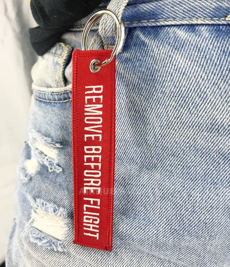 The history of the Remove before flight keychain is related to improving safety in aviation. These red ribbons with an inscription visually remind pilots, mechanics, and other personnel to remove certain components or protective covers before takeoff. This is an important step that ensures the safe operation of the aircraft.