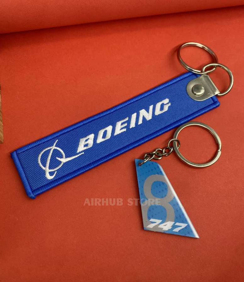 This set consists of two different key chains. The first is made of fabric in traditional blue with the Boeing logo. The second is plastic, made in the form of a vertical keel of an airplane with the number 747. Together, they create a bright set that is convenient to use for keys, a backpack, or a suitcase.