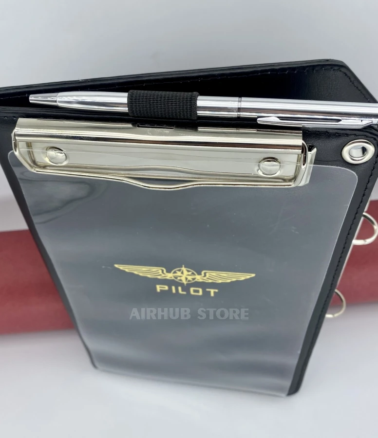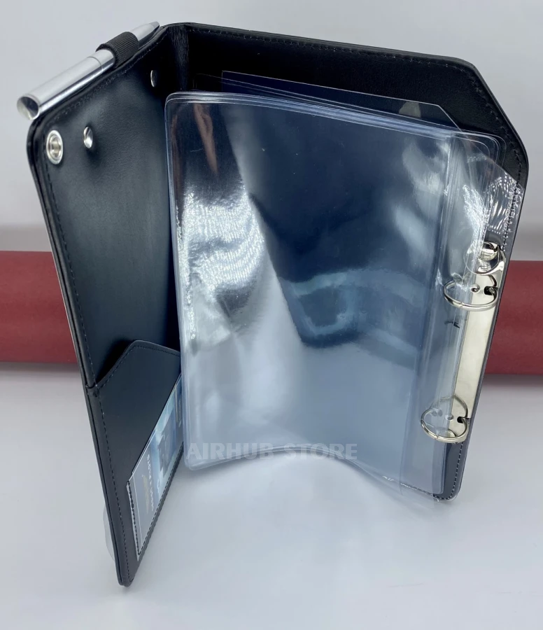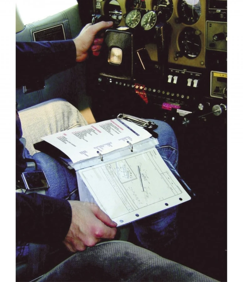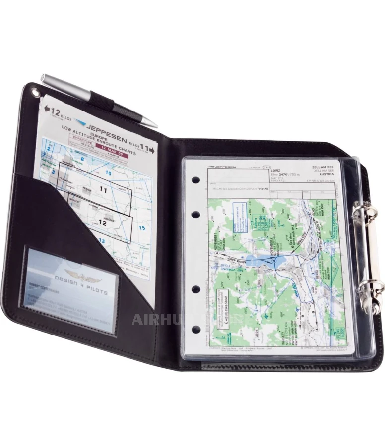 The PROFI lap board has a ring mechanism on the right, with a standard A5 width, for organization to keep your hand free during flight. Inside, there are 6 transparent pockets for approach charts and checklists, a map pocket, and a business card pocket.