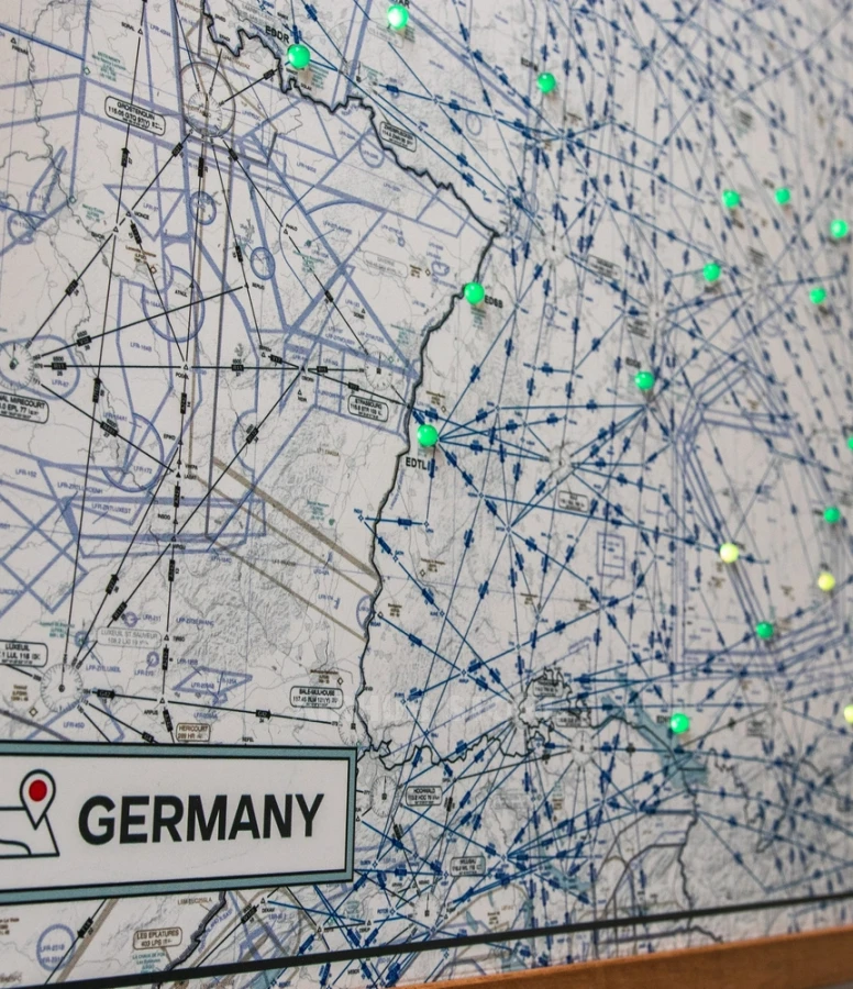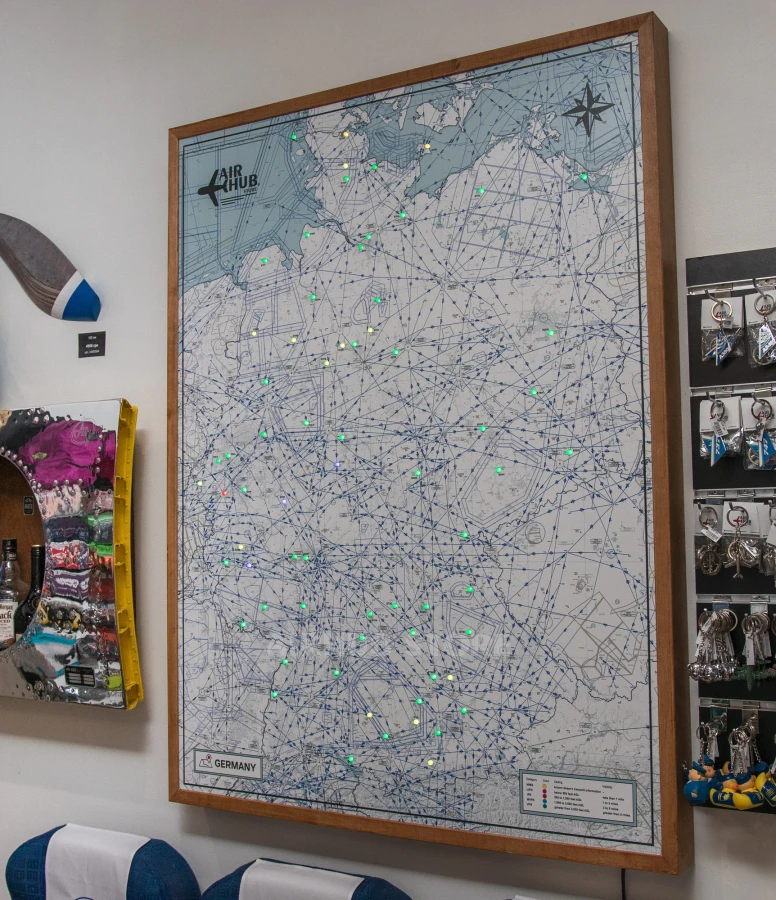 Germany. There are 68 diodes on the map, each of which corresponds to a specific airport. The weather status is updated automatically every 5 minutes via Wi-Fi based on official METAR reports. The map works via a regular power outlet - just plug it in and press the button.