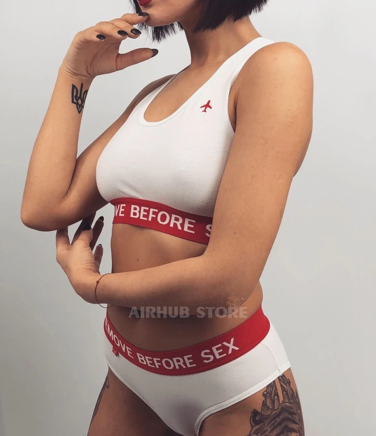 A stylish set of lingerie “Remove Before Sex” in white that combines boldness and sophistication. It was created for those who appreciate original design and want to emphasize their confidence.