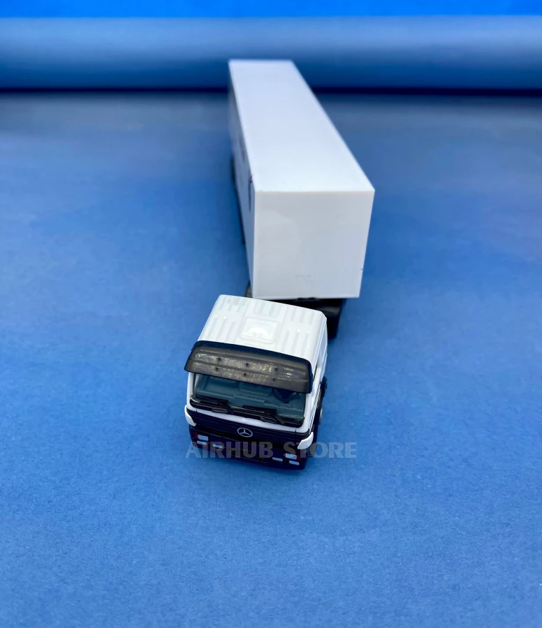 The Mercedes-Benz cab features the recognizable SK series design with carefully crafted details: mirrors, windows, headlights, and characteristic proportions. The paintwork is factory quality with clean lines and neat application of logos and branding elements.