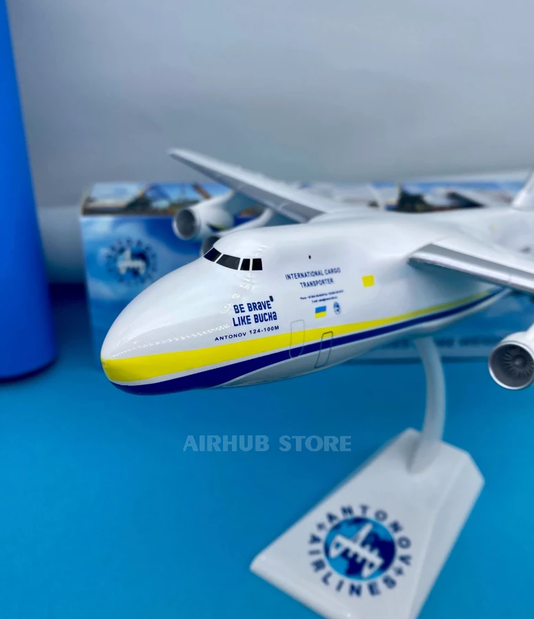This model aircraft replicates the Antonov An-124 Ruslan, one of the largest and most powerful transport aircraft in the world, created by the Ukrainian Antonov Design Bureau. This model is presented in the Antonov Airlines livery with special inscriptions Be Brave Like Mykolaiv, Bucha, and Irpin, which are united by the common idea of memory, strength, and resilience of Ukraine.