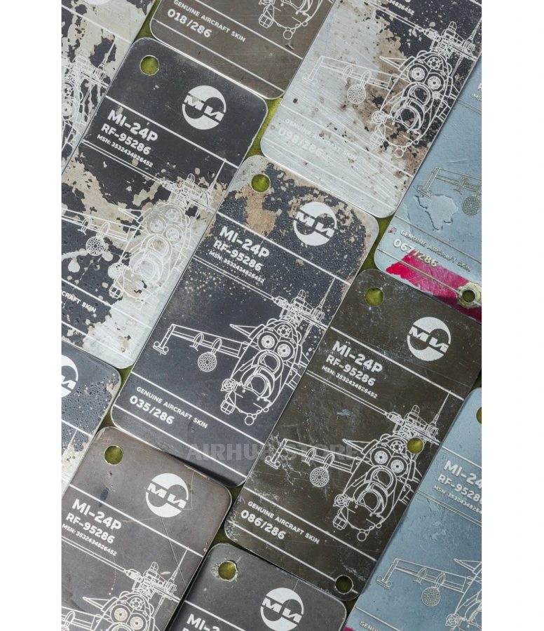 A keychain made of real airplane skin. These parts belonged to a Su-35S, a standard Russian Air Force aircraft, the letter S stands for “Stroyevoy”. The plane was engaged in combat operations against Ukrainian air defense in the Kherson region, near the village of Shlyakhove, and it was there that it met its final fate and was shot down.