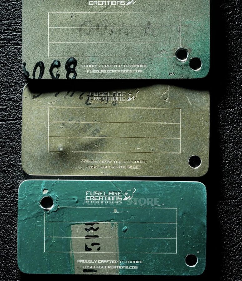 The keychain is made of real airplane skin, the airplane is cut into 286 pieces of keychains, each with its own unique number. The keychains are cut from the fuselage of a Mi-24P, military number 32 Red, registered as RF-95286. It was shot down near the village of Kozarovychi in the Kyiv region of Ukraine on March 5, 2022.