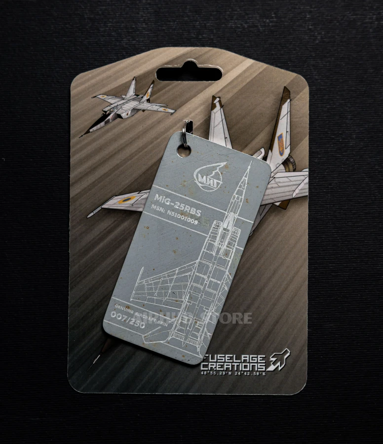 In the early 2000s, after the MiG-25 was finally retired from service with the Ukrainian Air Force, the aircraft was transferred to the Oleg Antonov State Aviation Museum. During the restoration of the vertical stabilizer, the team at Fuselage Creations was able to preserve a section of the skin and transform it into commemorative keychains. That is why this keychain is not just an accessory, but a real piece of aviation history that allows you to literally touch a legend.
