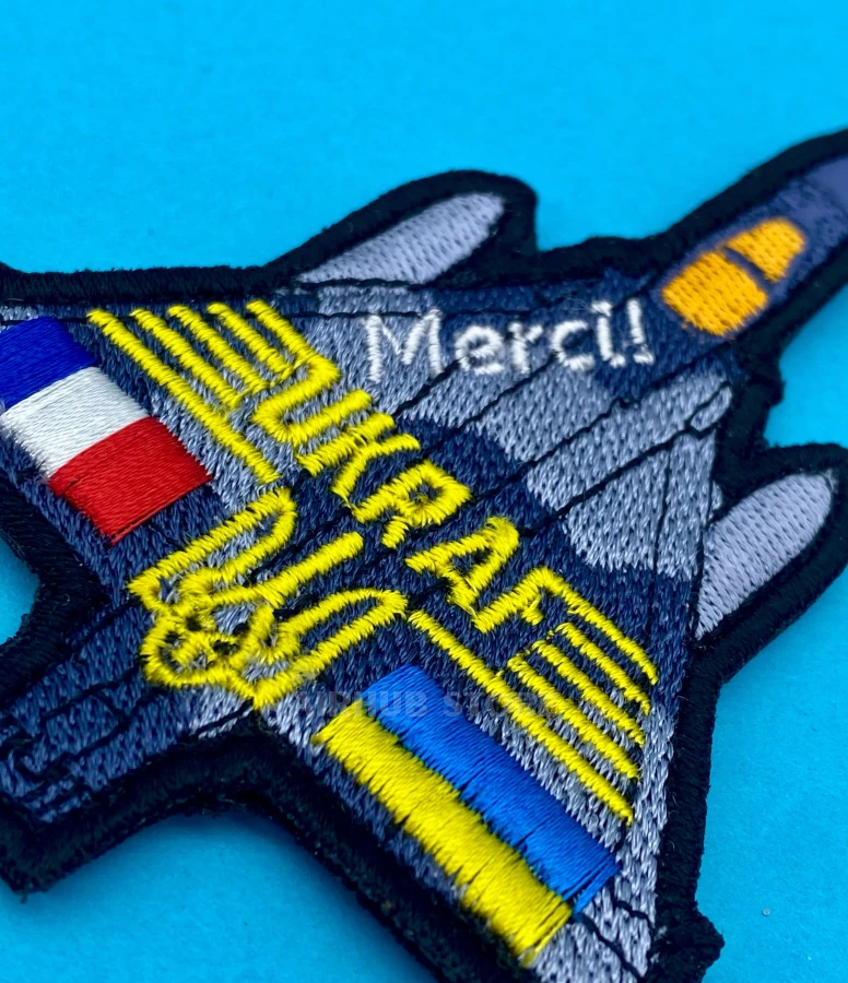 The patch features an embroidered French fighter jet with blue and yellow insignia and combat weapons, and the inscription Ukrainian Air Force in a circle. This design combines modern aviation with the Ukrainian context, emphasizing the support of the air force in times of war.