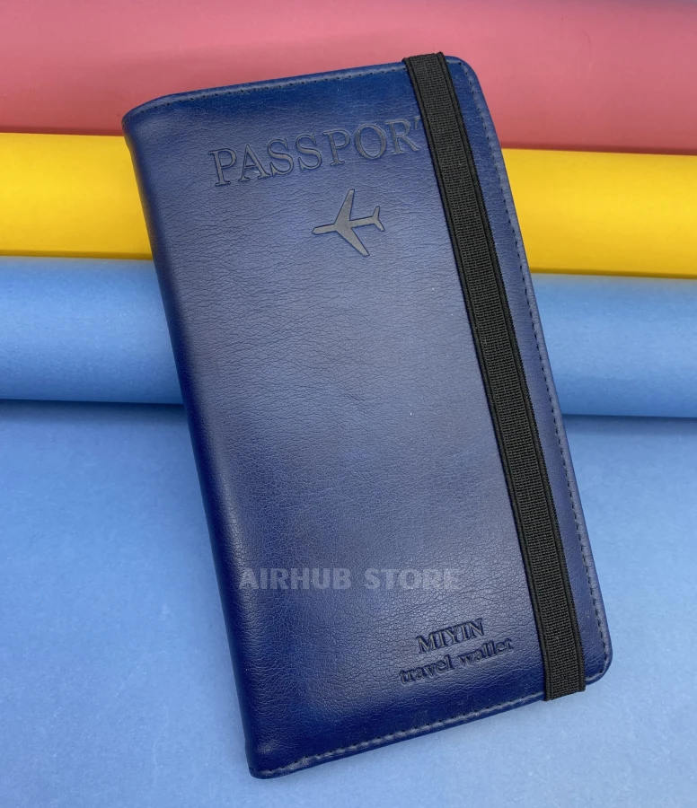 A functional travel organizer for convenient storage of passports, tickets, and cards while traveling. Equipped with an elastic band for secure closure.