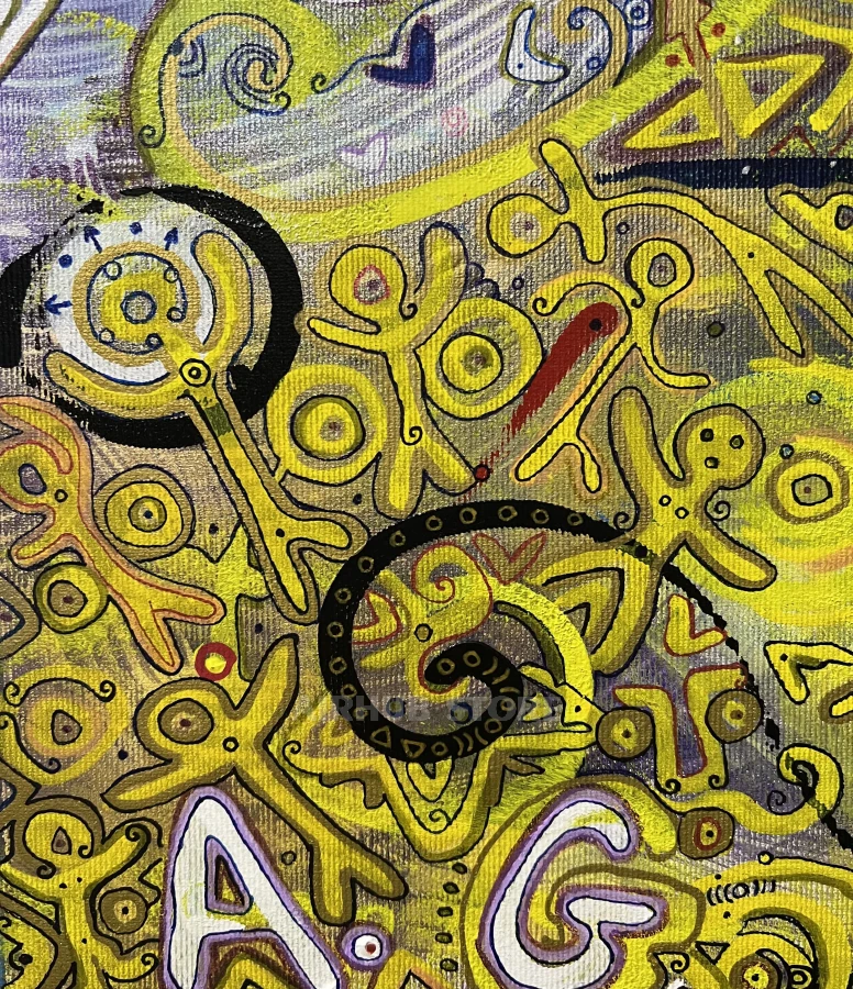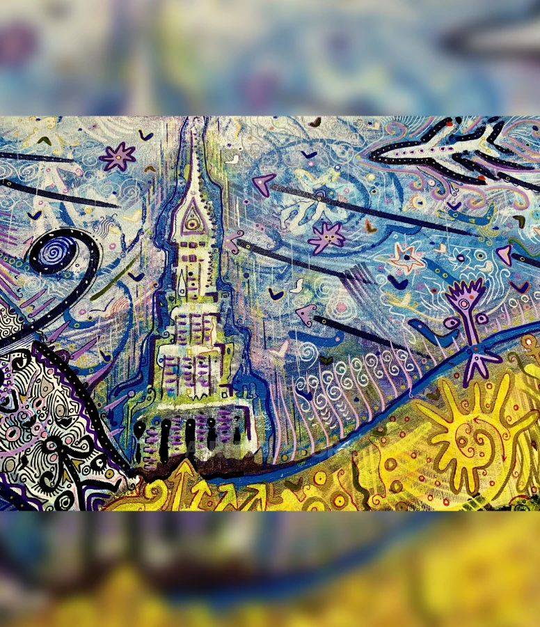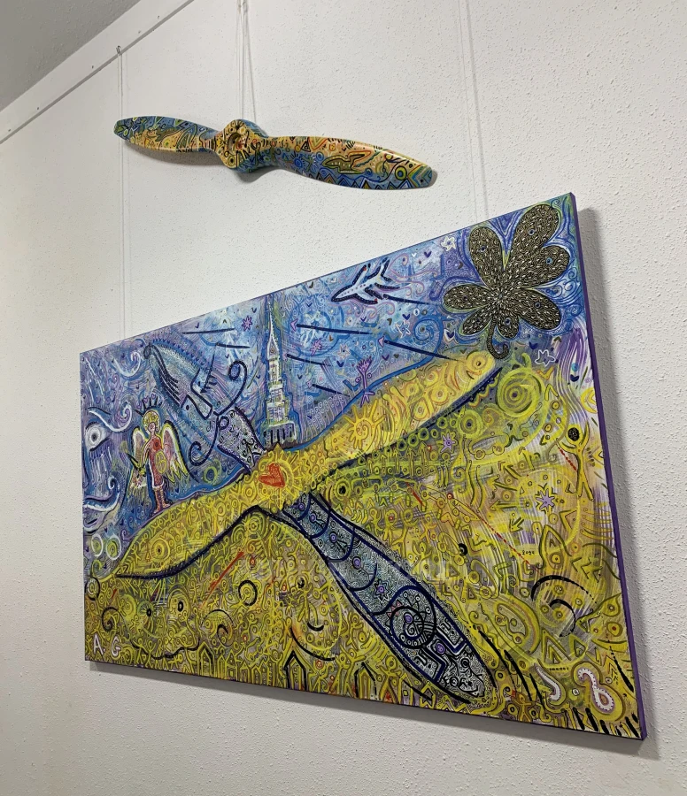 The image of UAV blades dominates the canvas, cutting diagonally across the composition. This is not a decorative element, but the structural axis of the painting, symbolizing protection, control, and movement. In the center of the composition, the main symbols of Kyiv are recognizable — silhouettes of architecture and the author's symbols of the city are integrated into the overall flow of lines and shapes.