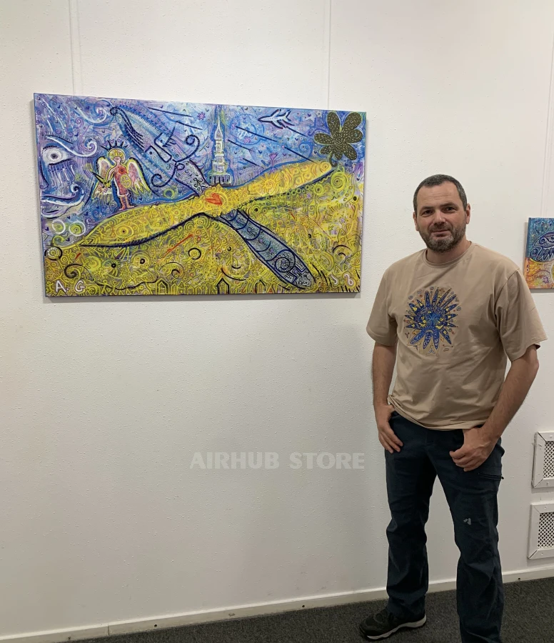 The author of the work is Avtandil Gurgenidze, a well-known artist, monumentalist, and photographer, a graduate of the Tbilisi Academy of Arts. His style is recognizable in its complex ornamentation, combination of symbols and technical forms, as well as in his ability to speak about complex topics through color, rhythm, and movement. In 2015, he became the first artist in the world to hand-paint an An-24 aircraft, transforming it into an aviation art object at Kyiv Airport.