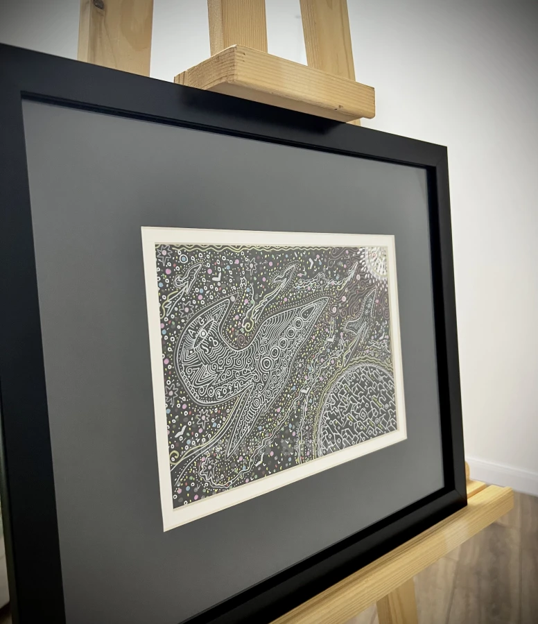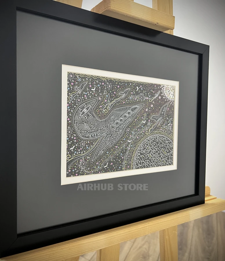 The painting is framed and matted, making it ready for display in any interior. The work will fit organically into a space associated with aviation, contemporary art, military themes, or a collection of art objects about Ukraine.