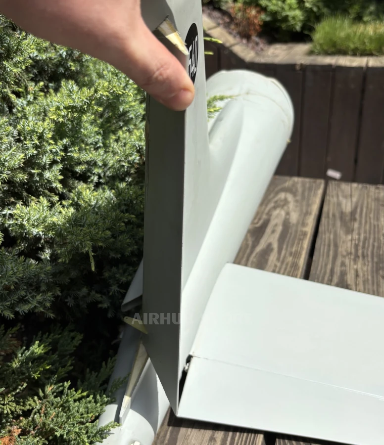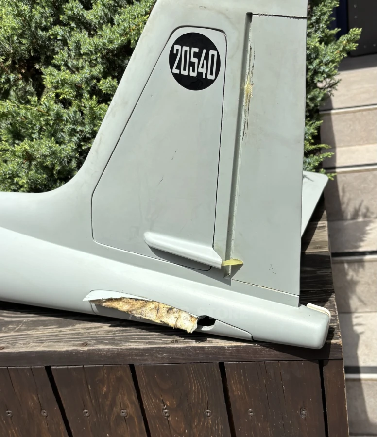 This fragment belongs to a Russian Orlan-10 unmanned aerial vehicle that was shot down by Ukrainian defense forces. The Orlan-10 is an advanced reconnaissance drone that was used by the enemy to target artillery and conduct surveillance. The presented fragment is an authentic part of this drone, saved after it was destroyed in the combat zone.