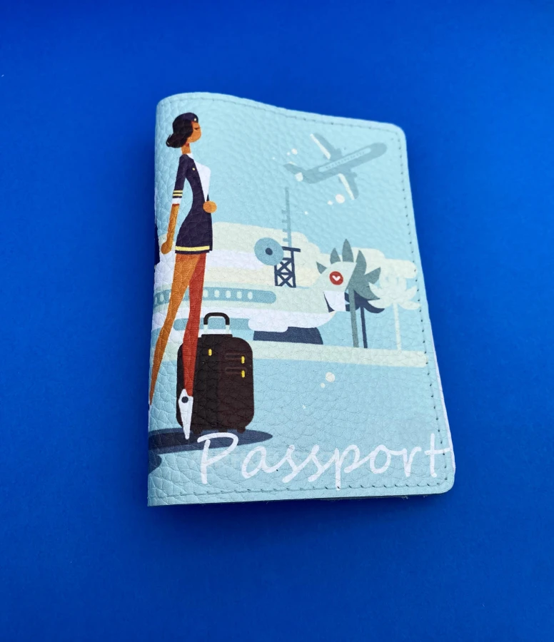 This bright passport cover is designed for those who cannot imagine life without travel and the sky. Made of high-quality pressed leather, it combines durability, lightness, and a pleasant texture. The retro-style illustration of two flight attendants against the backdrop of an airplane symbolizes the romance of travel and a love of aviation.