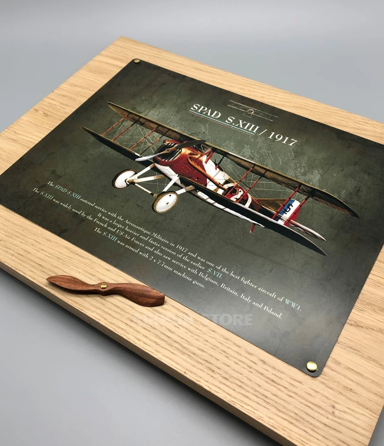 This wall poster tells the story of one of the best fighters of the First World War - the French SPAD S.XIII. The illustration is made in a vintage style, and the text in English describes the features of the aircraft. It is suitable for decorating an office, living room, or as a gift to a person who appreciates aviation history.