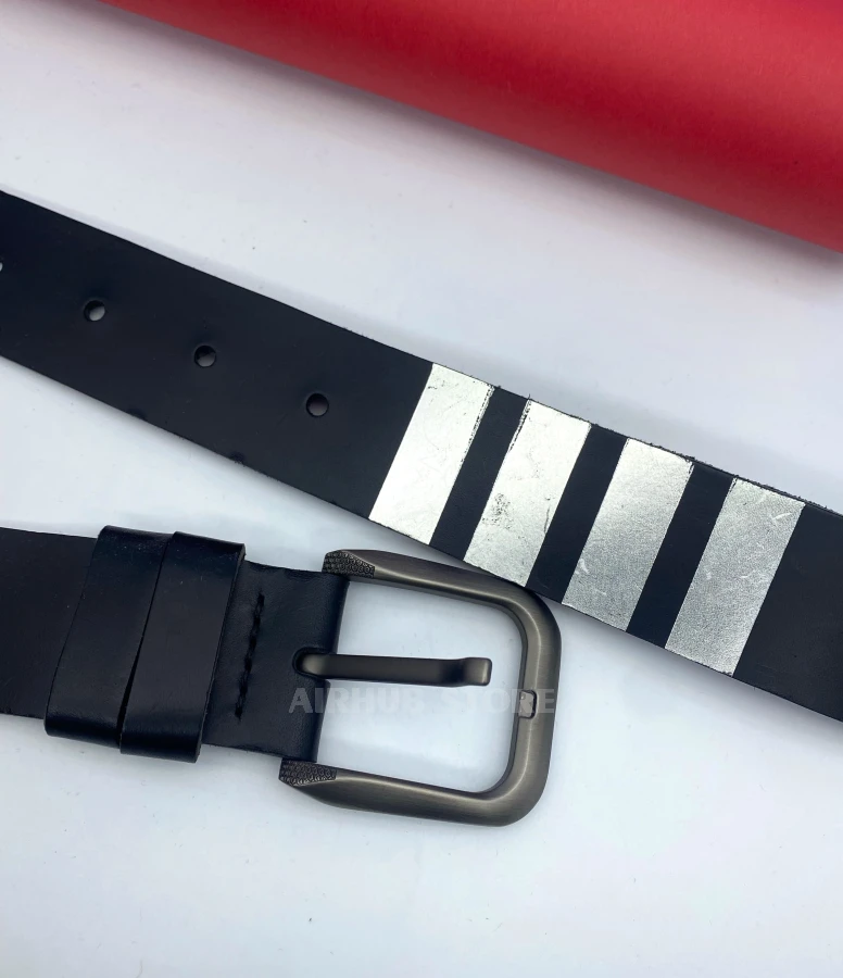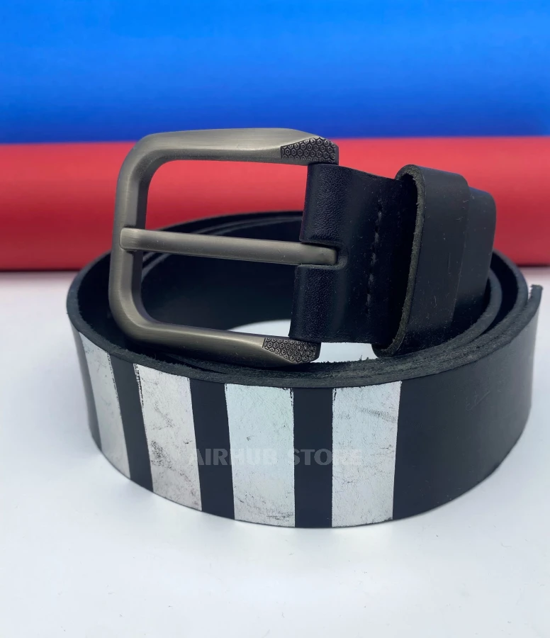 Leather belt with silver stripes in pilot style. Understated aviation design for everyday wear.