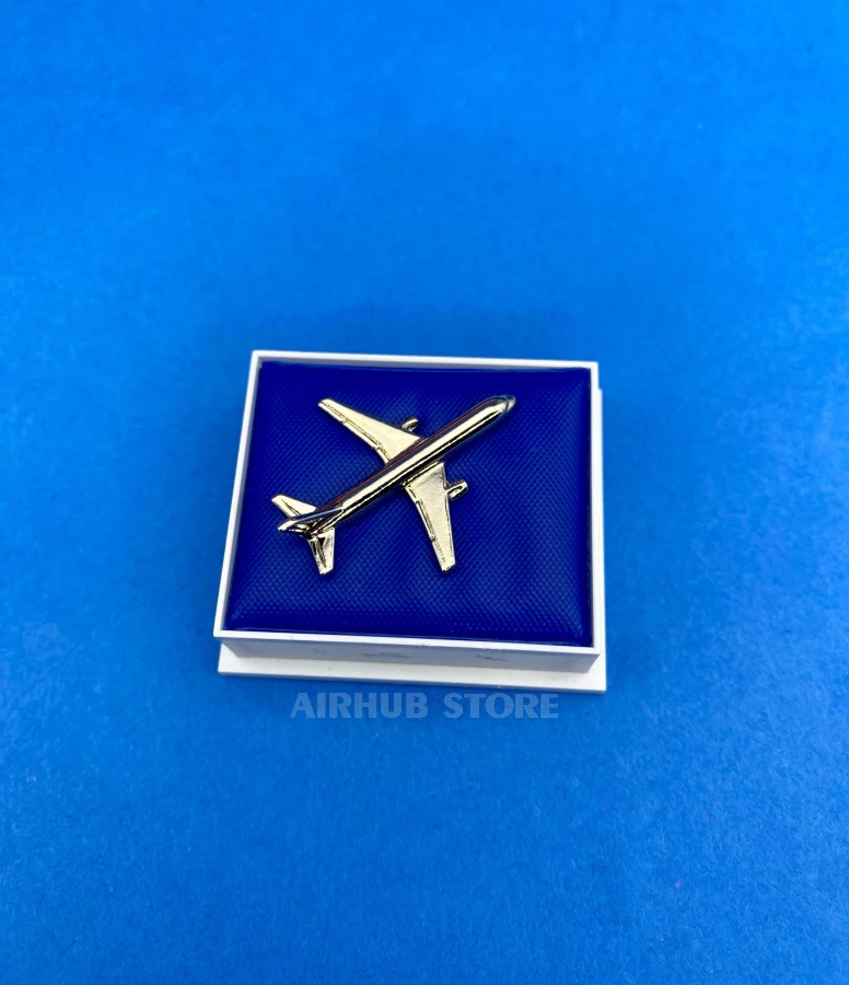 The Boeing 757 metal pin reproduces the characteristic proportions of one of the most recognizable airliners of its generation. The elongated fuselage, clean wing geometry, and balanced silhouette make the aircraft easily recognizable even in miniature.