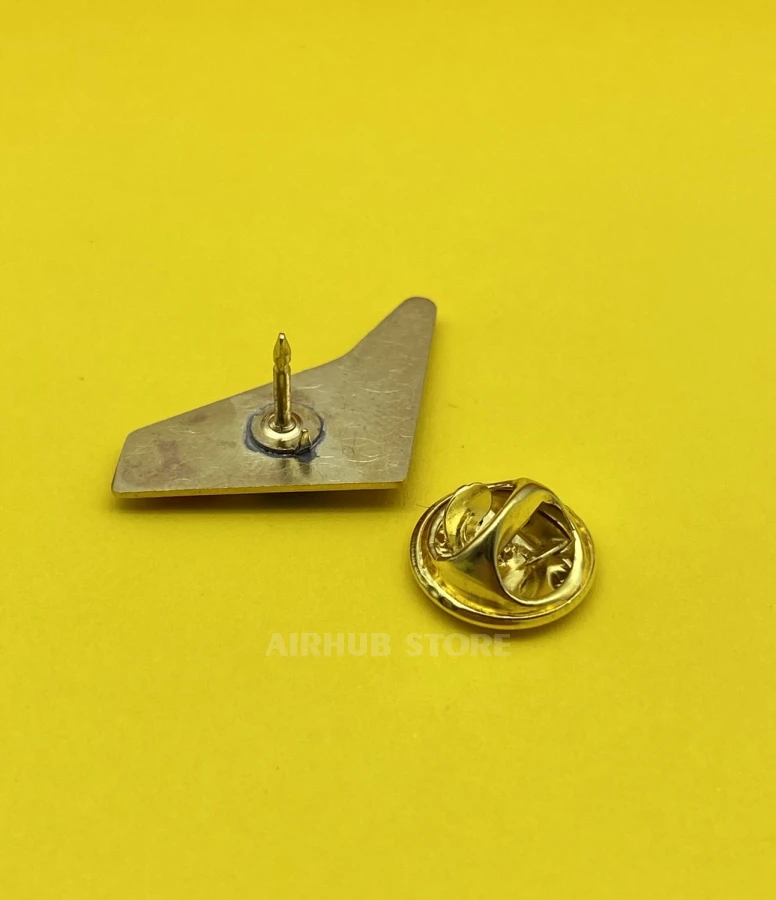 A badge in the shape of the tail feathers of the Skyline Express airplane for aviation fans. The sophisticated combination of navy blue and orange lines recreates the airline's signature livery. Perfect as a gift, part of a collection or an element on a bag or jacket.
