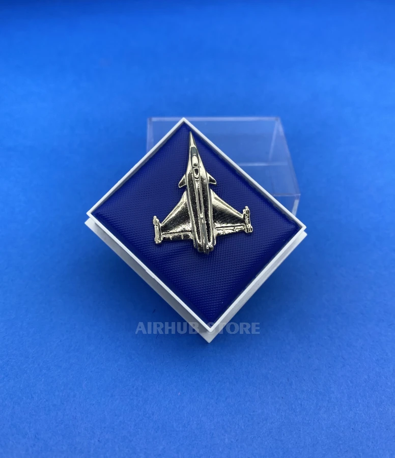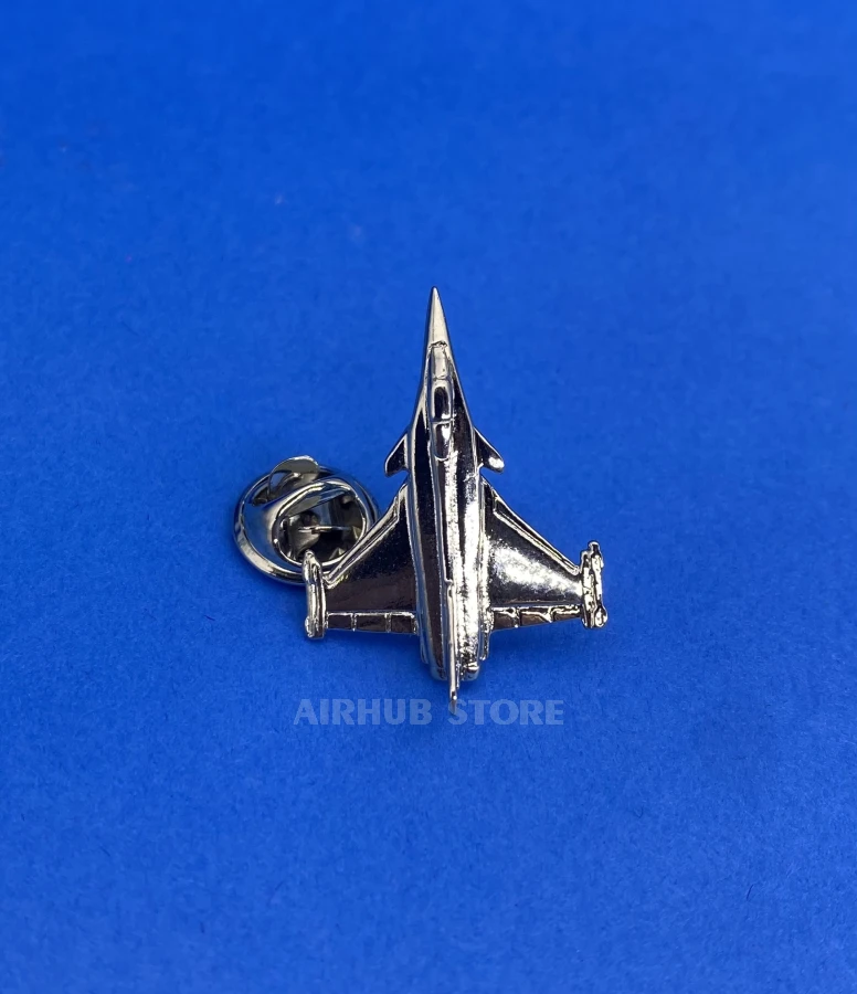 This metal pin is shaped like the silhouette of a Rafale fighter jet, one of Europe's most famous modern combat aircraft. With its clean lines and high-quality casting, it looks detailed and immediately catches the eye of anyone who knows a thing or two about aviation. This accessory goes well with both everyday style and more formal attire.