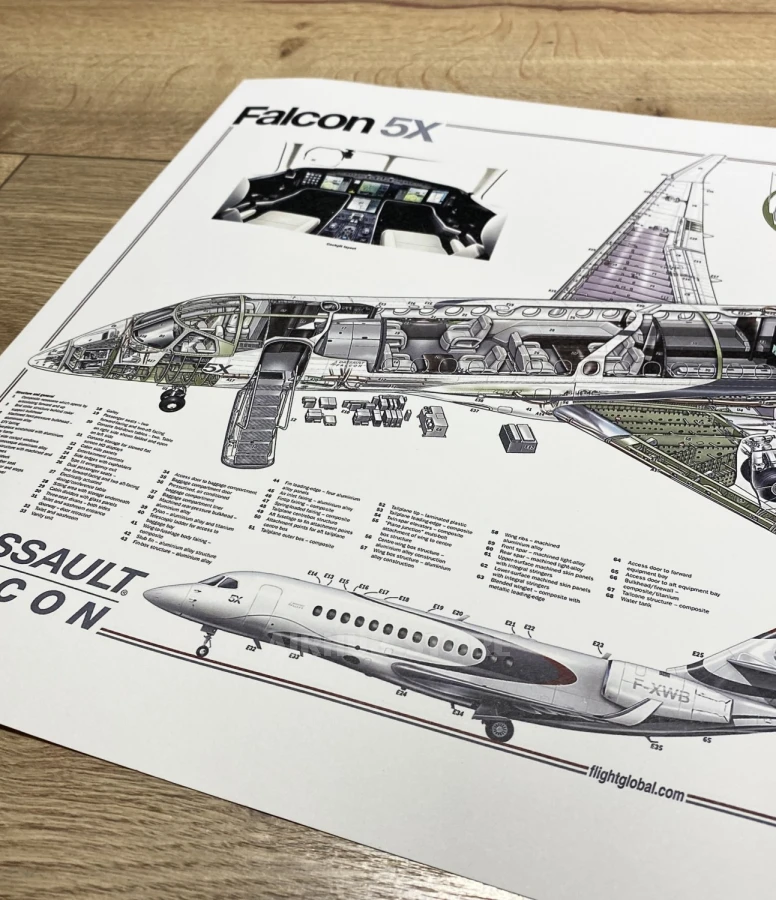 Introducing the Falcon 5X business jet poster. This poster is made of heavy paper and is white in color. The poster features a layout diagram of the Falcon 5X, which shows the airplane in section and demonstrates its internal structure and design in detail.