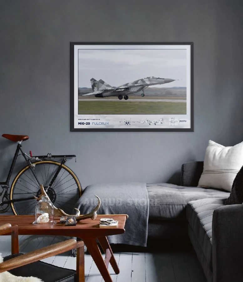 Poster with MiG-29 Fulcrum airplane, the poster depicts a vivid and detailed image of the legendary of this airplane. This poster will make a great gift for someone who is interested in military airplanes.