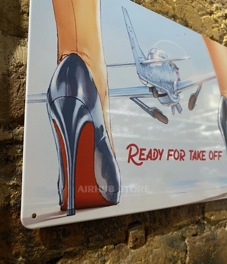 Not just decoration, but a true mix of style, humor, and aviation aesthetics. At the center of the composition is a classic fighter jet preparing for takeoff, and in the frame are legs in luxurious high-heeled shoes. The illustration is done in a retro pin-up style, popular in the 1940s–60s, when aviation was not just technology but part of pop culture. Such signs decorated hangars, bars, and pilots' homes.