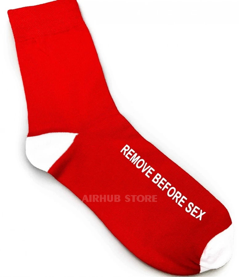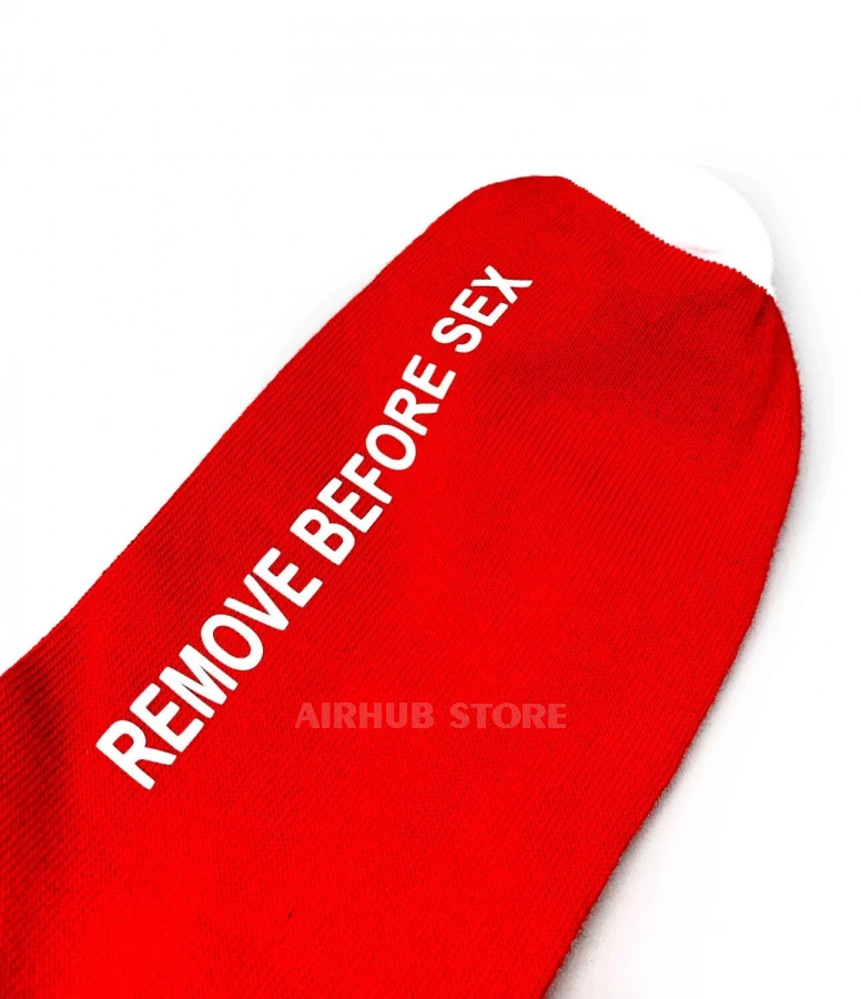These socks are a playful interpretation of the classic REMOVE BEFORE FLIGHT aviation tape, which is attached to the elements of an airplane before the flight. In our version, it turned into a provocative inscription REMOVE BEFORE SEX - a joke with a double meaning that is understandable to all fans of aviation and good humor.