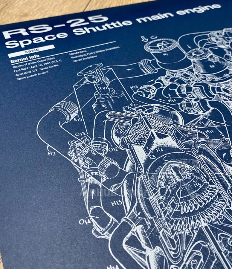 This poster is dedicated to one of the most complex and powerful rocket engines in the history of space exploration. The RS-25 was used on NASA space shuttles and is an example of extraordinary engineering excellence, where every component and pipe is critical.