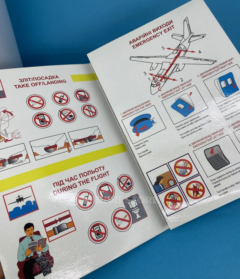 These cards were placed in the seat pockets of passengers on An-24, An-74, An-140, and Yak-40 aircraft. Each instruction contains bilingual text (Ukrainian and English). These are not copies, but original copies that were on board real airliners flying within Ukraine and abroad.