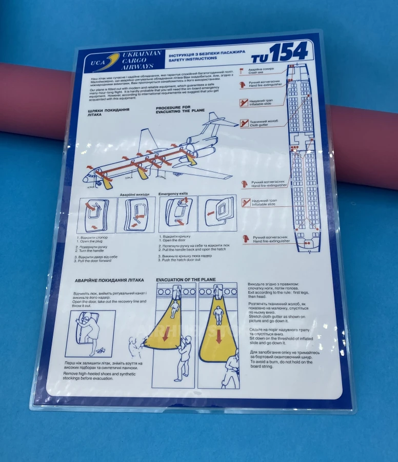 You can order TU-154 safety cards on our website or purchase them at our store located at 50b Khreshchatyk Street, Kyiv. We provide fast shipping worldwide and guarantee the quality of every product.