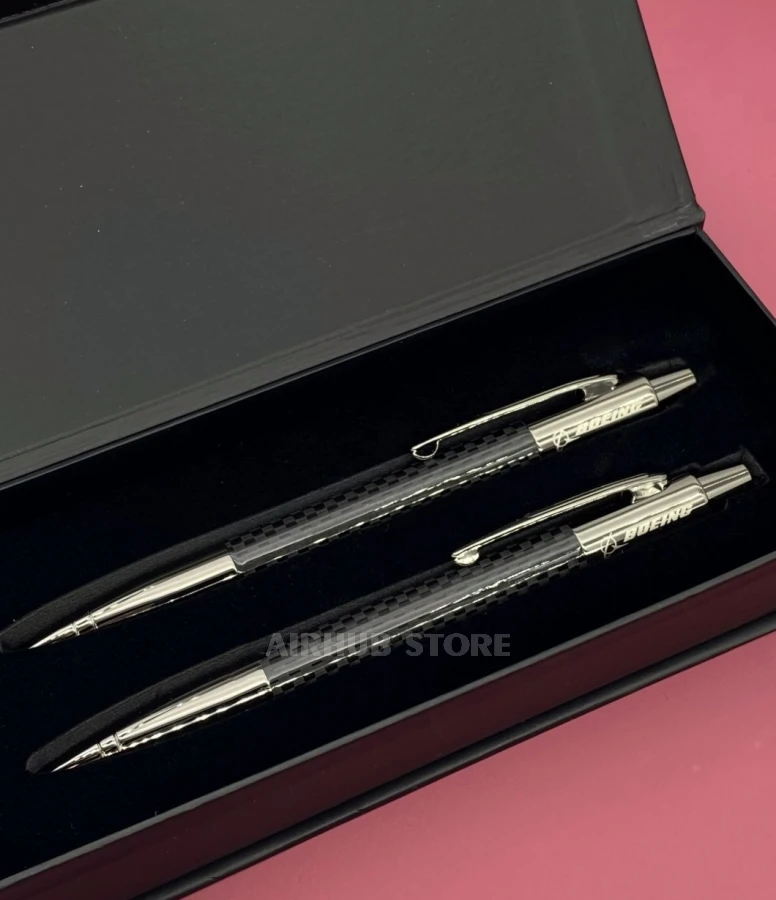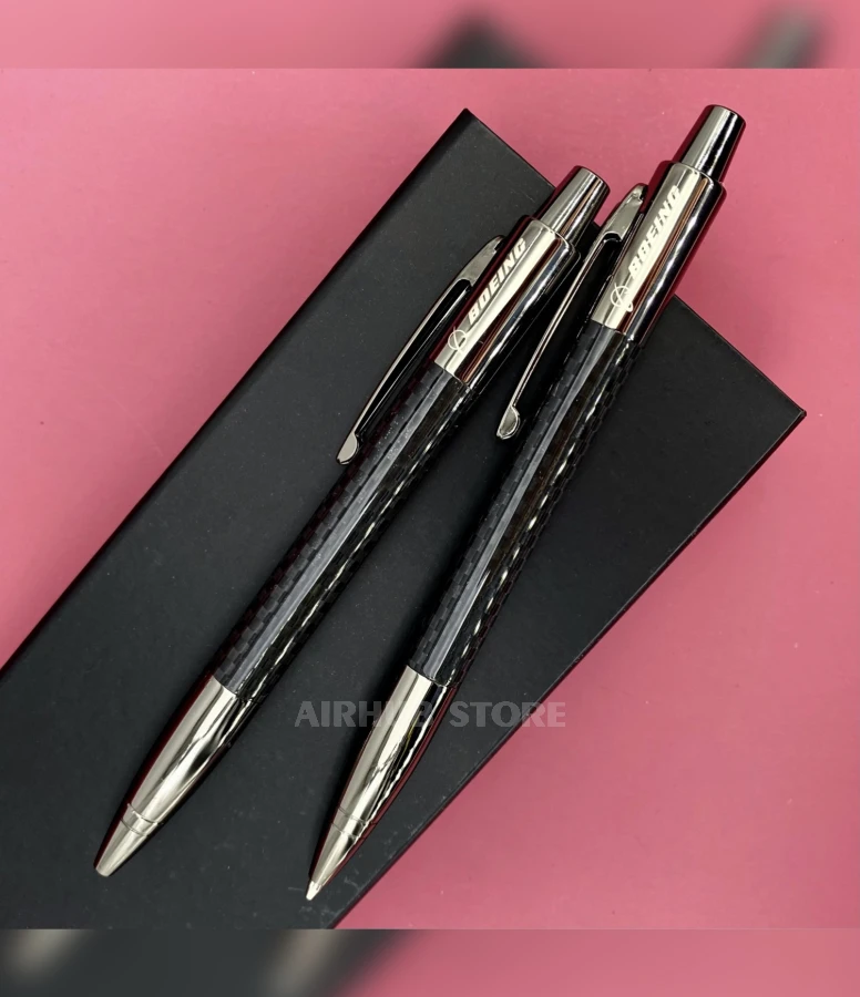 Carbon fiber is a low-density material used in the innovative 787 Dreamliner. The set includes a ballpoint pen and a mechanical pencil. They are made of brass, steel and real carbon fiber. The Boeing logo is laser engraved on the top of the pen and pencil.