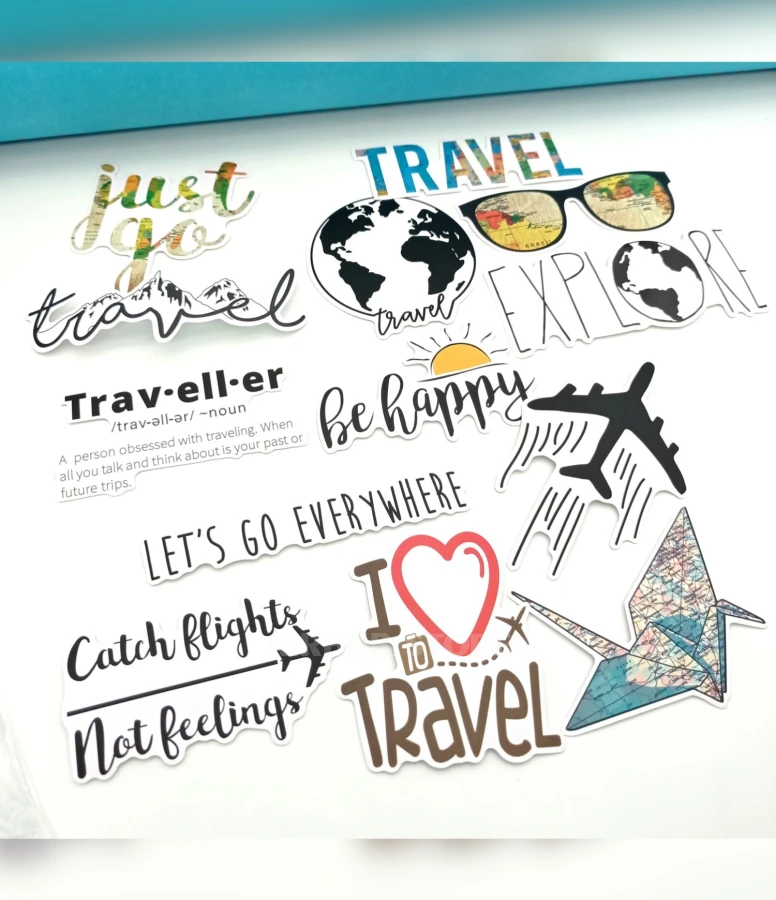 Our Travel sticker set is designed especially for travel enthusiasts who want to share their desire for discovery and adventure. The set contains different shapes and sizes of stickers, which gives you many options for creative decorating.