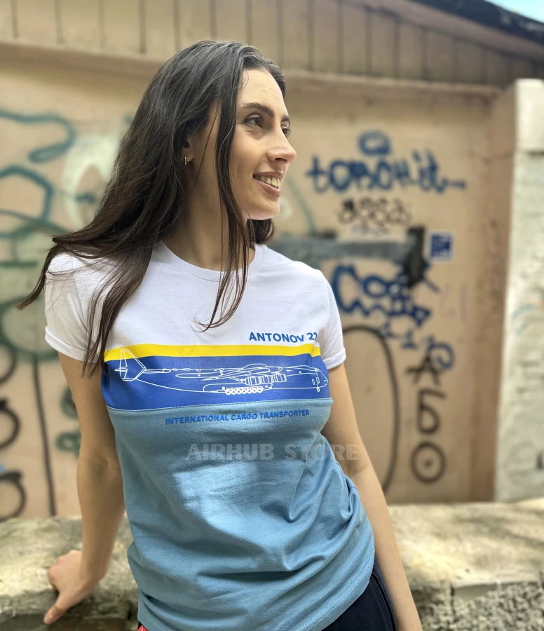 An original women's T-shirt with an image of the AN-225 Mriya airplane.