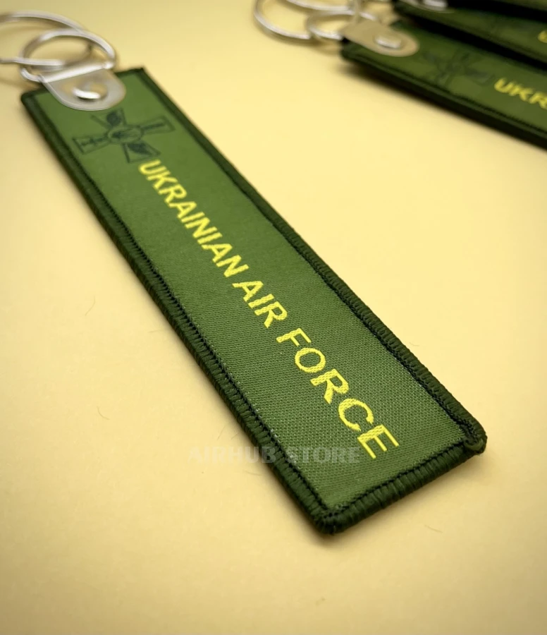 Ukrainian Air Force series with a woven image of an F-16 in green and metal fittings.