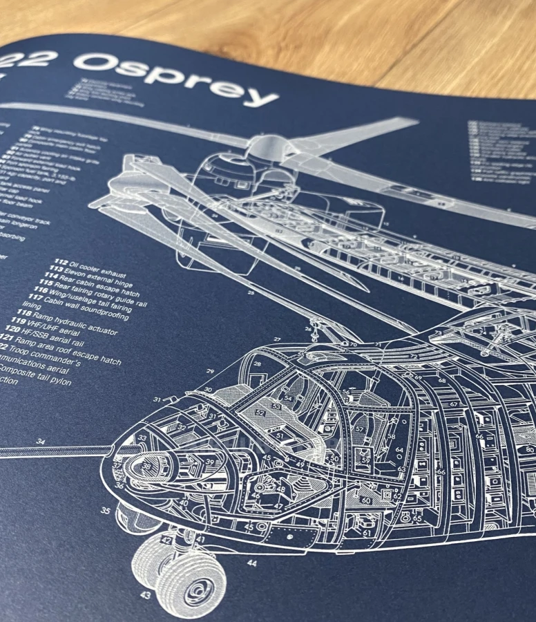 Poster with drawing of the V-22 Osprey aircraft, the dark blue poster shows the layout diagram of this aircraft. All elements are numbered and described around the image, where a transcription with description is indicated. The poster itself is printed on heavy blue paper, measuring 61 cm by 33 cm.
