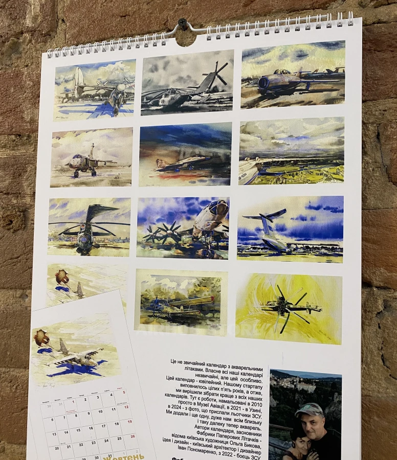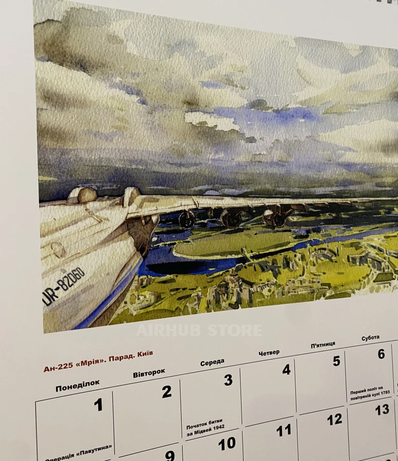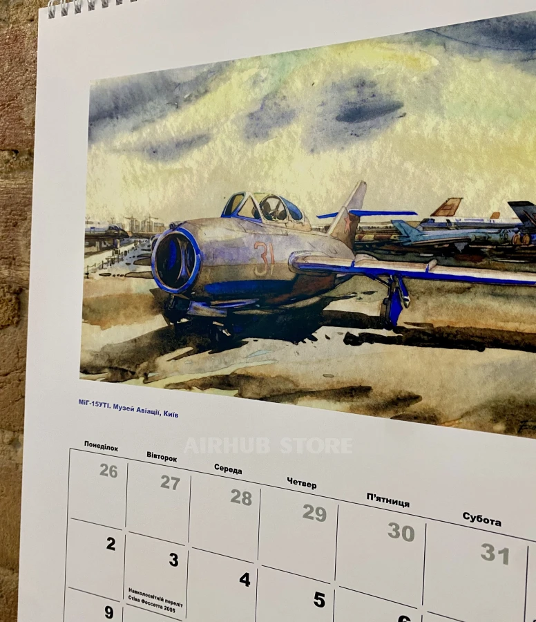 This calendar is a jubilee edition, created in honor of five years of publication. This calendar brings together the best watercolor works from different periods: there are works painted in 2010 right in the Aviation Museum, in 2021 in Uzyn, and in 2024 from photos sent by Ukrainian Air Force pilots. We also added another watercolor painting of the AN-225 Mriya, which is very dear to all of us and now so far away.