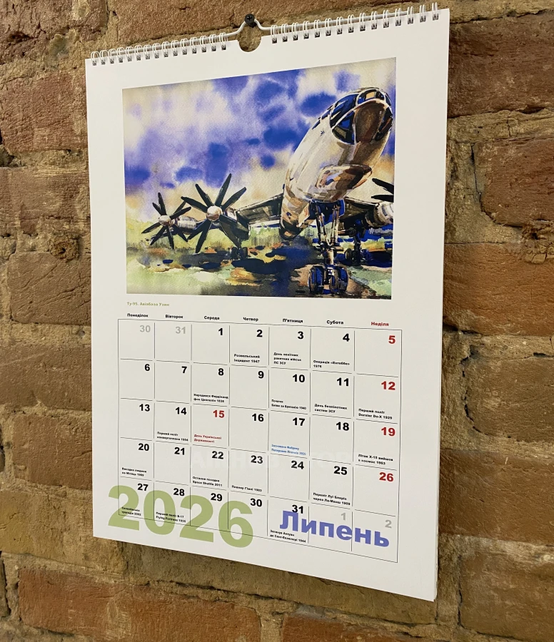 The pages of the calendar bring to life aircraft that are well known to everyone who loves the Ukrainian sky. There is the Be-12 Chaika, MiG-15, MiG-29, Su-24, Tu-95, Il-76, Mi-6 and Mi-24 helicopters, and the legendary An-2. A special place is reserved for a watercolor painting that is particularly dear to many — the An-225 Mriya, painted from its ceremonial flight over Kyiv.