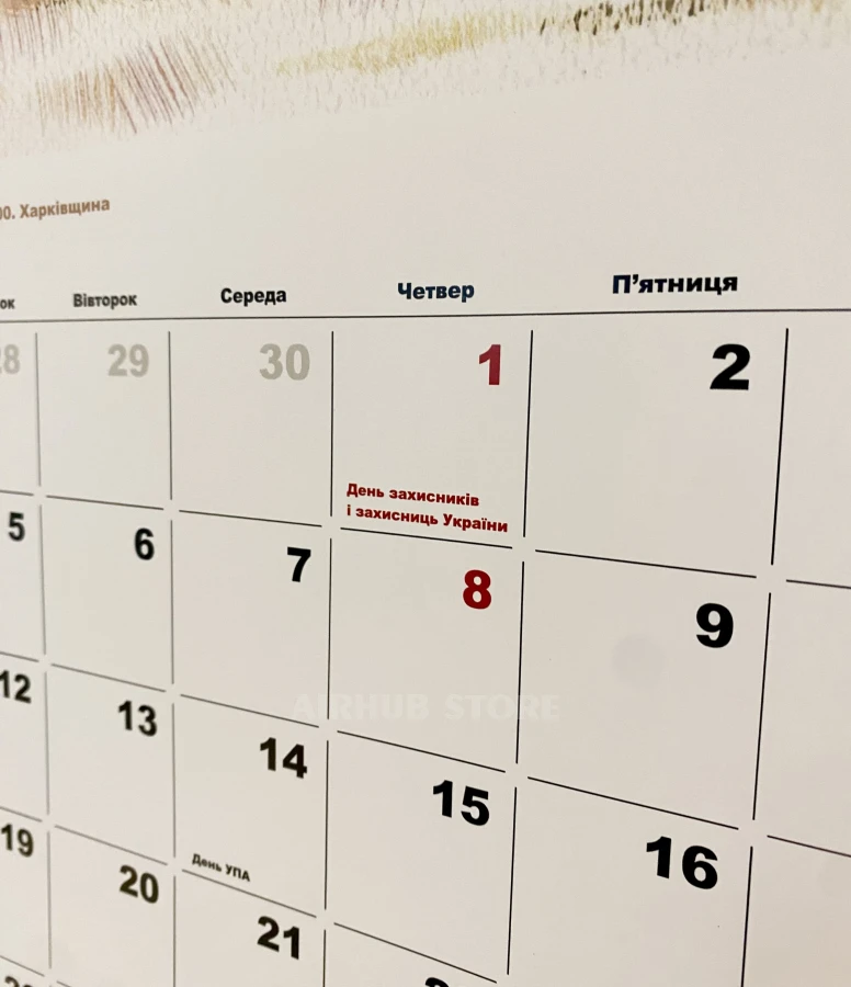 Each month has a convenient daily organizer, which, in addition to national holidays, marks military days—the days of the branches and services of the Defense Forces. The idea and design of the calendar came from Kyiv architect Ivan Ponomarenko, founder of the Paper Airplane Factory, and since 2022, an aerial reconnaissance officer and fighter in the Armed Forces of Ukraine.