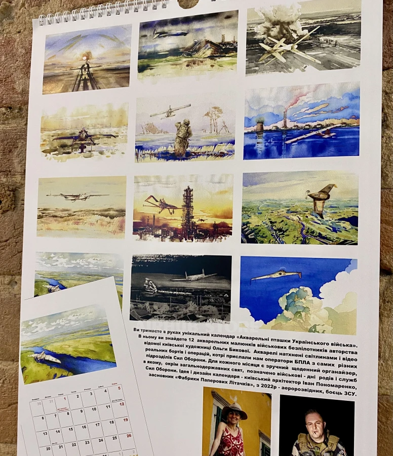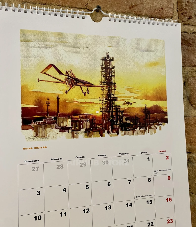 This calendar creates a special atmosphere—each month is accompanied by a watercolor painting executed with incredible skill. In it, you will find 12 watercolor paintings of military drones by the well-known Kyiv artist Olga Bykova. The watercolors are inspired by photographs and videos of real aircraft and operations sent by UAV operators from various units of the Armed Forces.