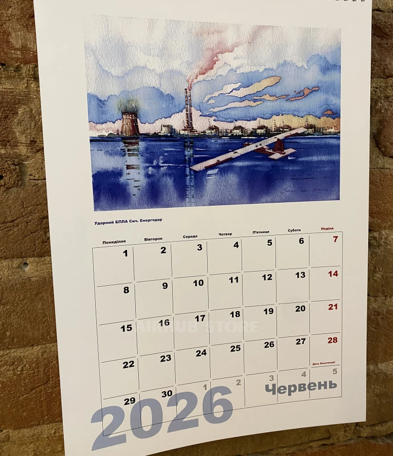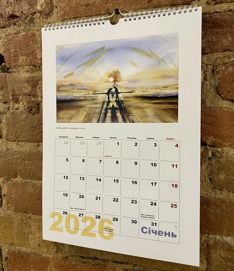 Throughout the year, the calendar features various Ukrainian drones, each in its own atmospheric watercolor scene. Among them are the Shark reconnaissance drone, Raybird 3, RAM-2X loitering munition, Darts Ukrainian kamikaze drone, Sych strike UAV, Fury 2 over Kherson region, Lyuty, Domacha, Leleka-100, and others. All illustrations convey the real places, terrain, and atmosphere in which the drones operate every day, making the calendar look lively and as authentic as possible.