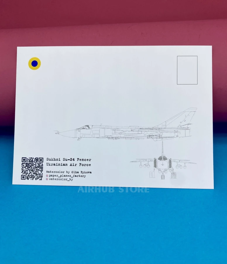 These postcards are based on real watercolor paintings dedicated to combat aviation and the Ukrainian Air Force. The illustrations depict legendary aircraft—the Su-24 front-line bomber and the Su-25 attack aircraft—flying among the clouds and light of the sky. The watercolor technique gives the works softness, depth, and a sense of space. The smooth color transitions, transparency of the paints, and dynamic composition create the effect of a living sky and movement in the air.